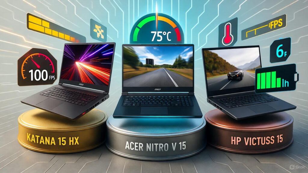 The MSI Katana pulls ahead in raw power, but the HP Victus edges battery for portability. In contrast, the Acer Nitro V’s AMD efficiency shines for creators multitasking Premiere and gaming.